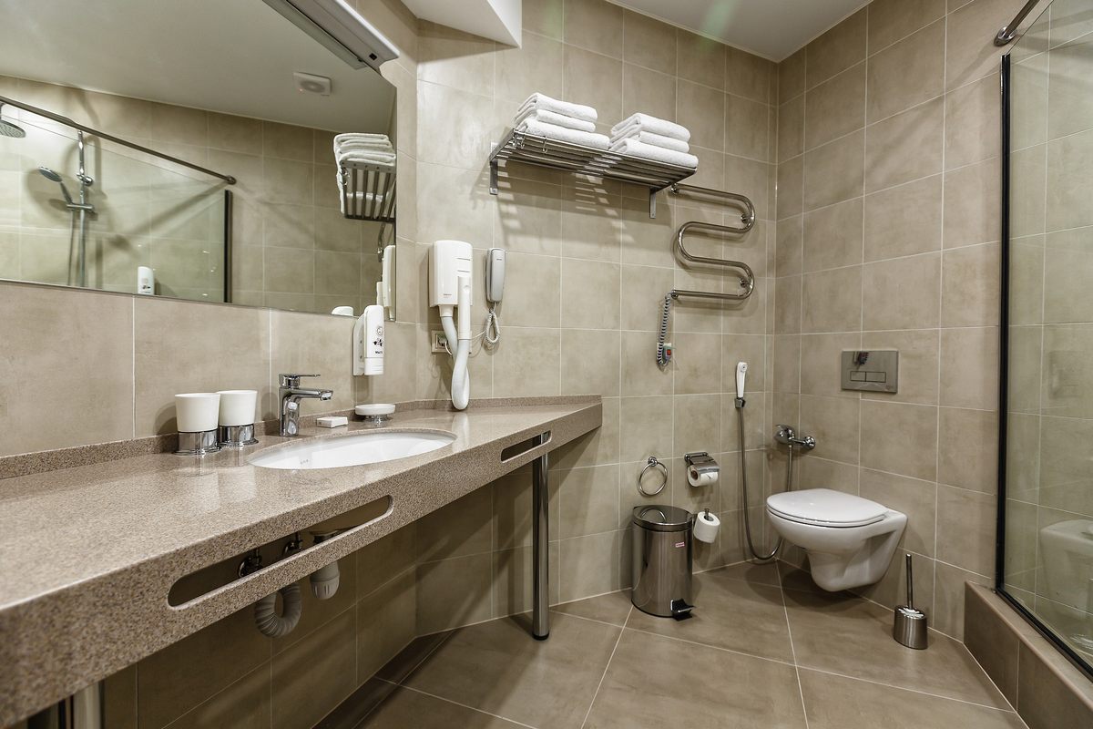 Санузел: душ, раковина, унитаз, биде, фен